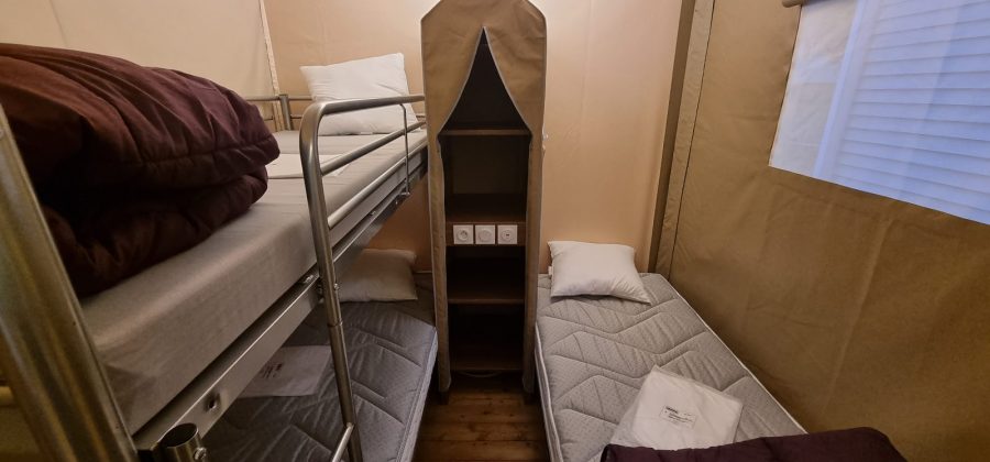 Pour encore plus de confort, nouveauté 2021, le camping c’est doté de deux tentes safari wood lodge tout équipé. Le plaisir du camping comme dans le temps version moderne. 1 chambre avec un lit double, et une chambre avec lit superposé + lit simple. Salle de bain et cuisine. Venez-vous réveiller et prendre vôtres petit déjeuner sur la terrasse avec une vue imprenable sur le lac.